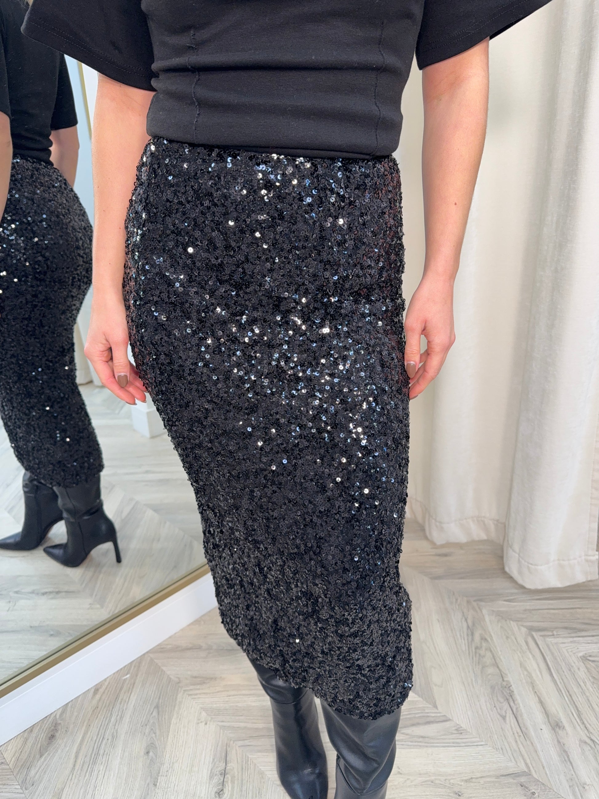 Dazzle in this show-stopping sequin midi skirt that transforms any occasion into a celebration. Crafted with shimmering sequins that catch the light with every move, it's the perfect piece to elevate your everyday style or steal the spotlight at special events. Available in sizes 8-16, this black beauty pairs effortlessly with basics for maximum impact. Get ready to turn heads and feel absolutely fabulous.