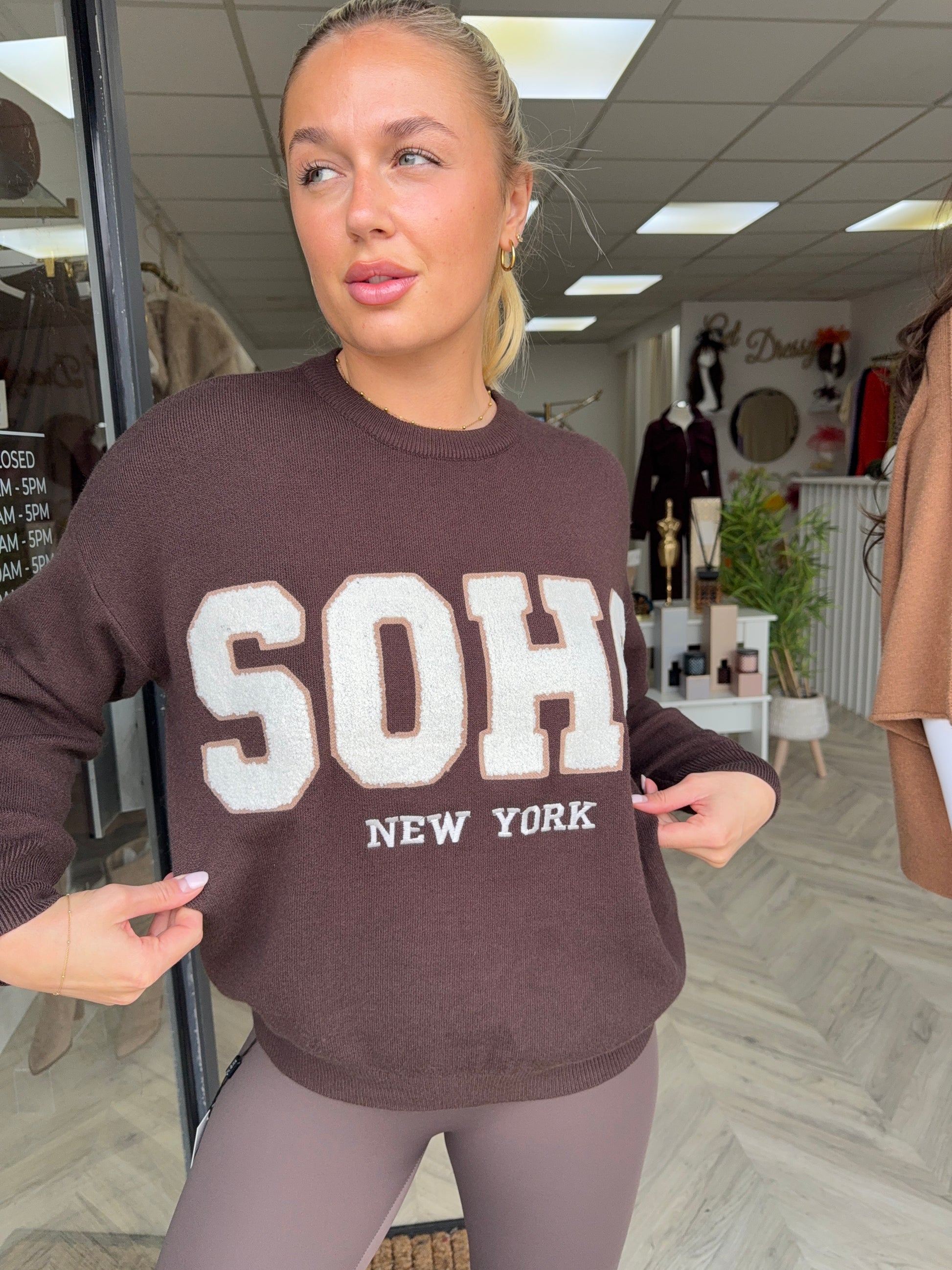The Paris Knitted Sweater in dark brown is a top-quality sweater with a rating of 10/10. Its one size is versatile and can comfortably fit up to a size 16. Stay stylish and cozy with this must-have addition to your wardrobe.